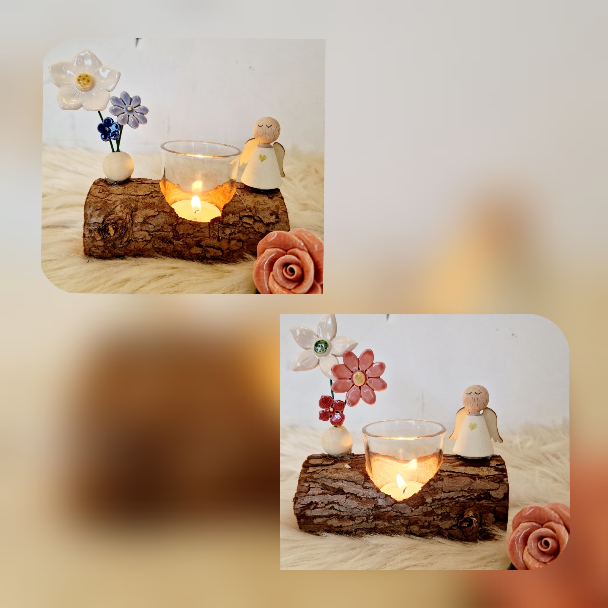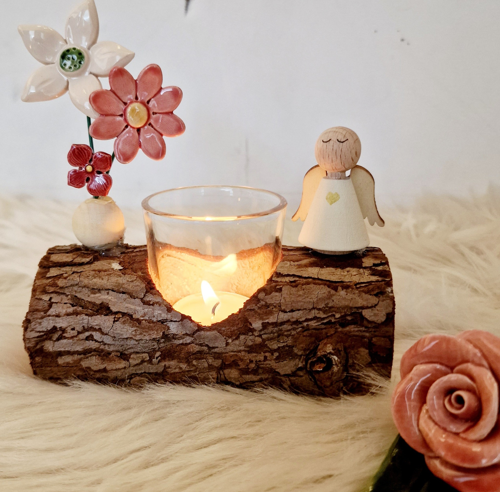 Een natuurlijke boomstam met houten engeltje, een kaarsje en 3 keramieken bloemetjes.