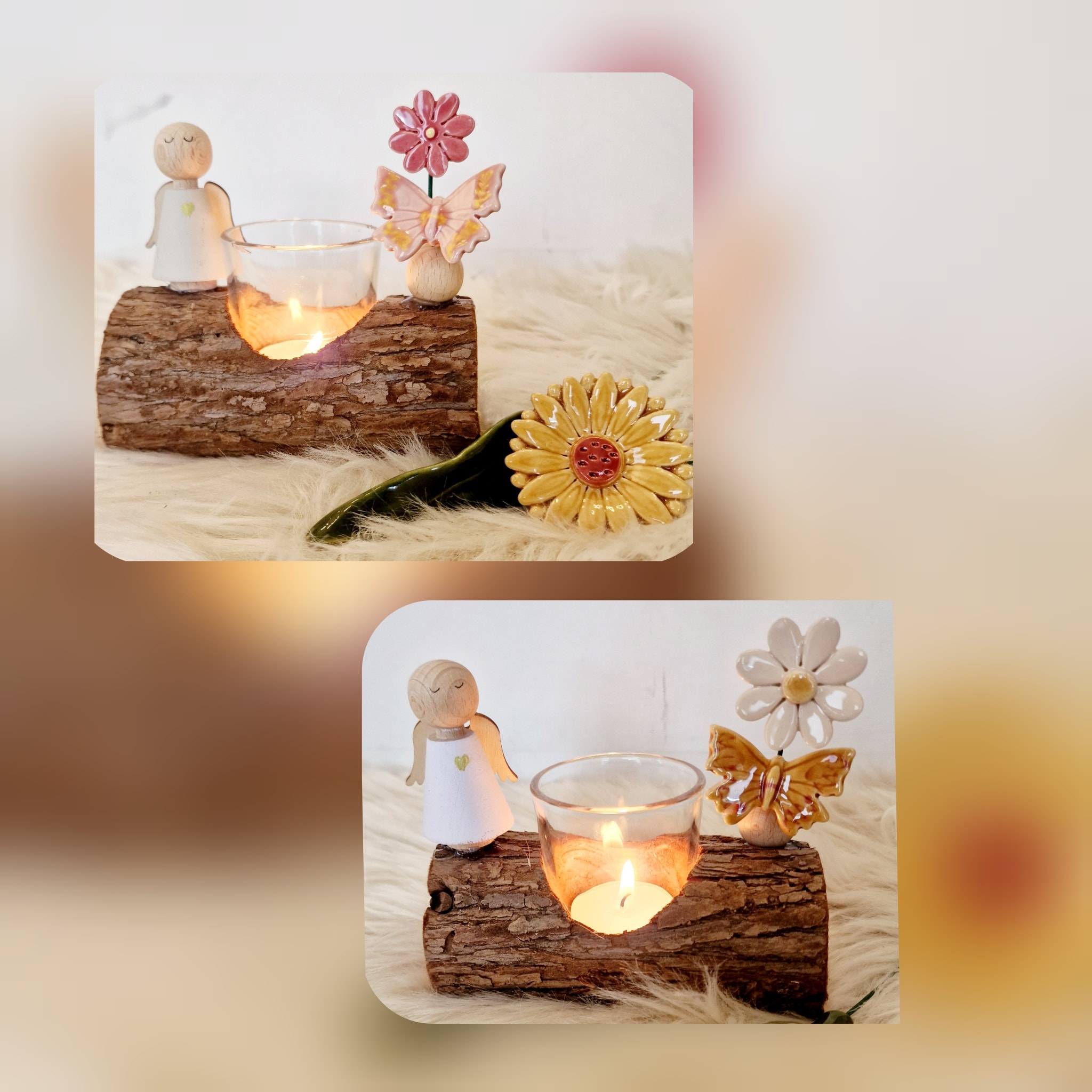Een boomstam met een houten engeltje dat waakt, een kaarsje dat zacht licht brengt en de vlinder met het bloemetje dat troost en liefde uitstraalt.