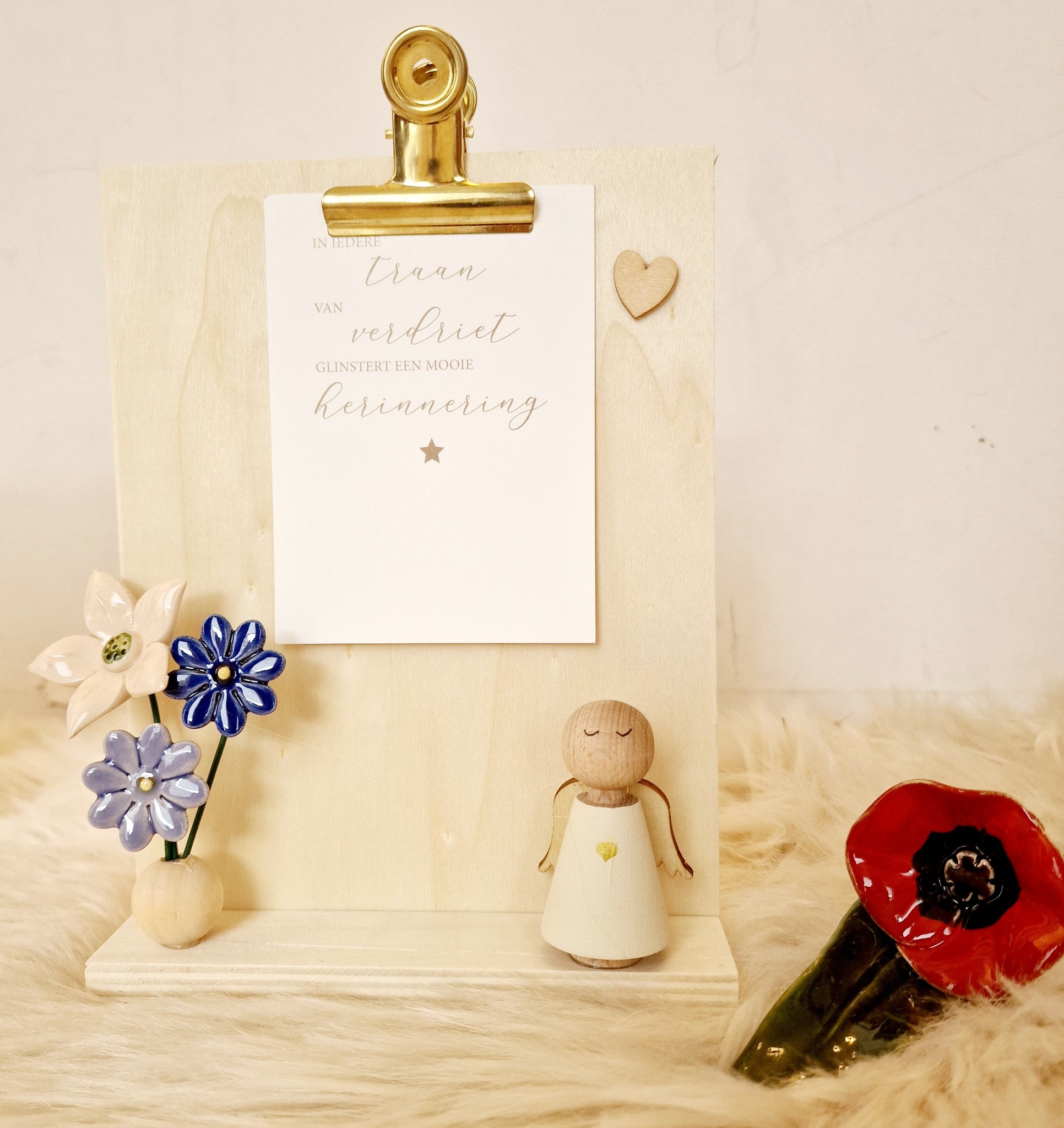 Het houten engeltje staan als symbool voor liefde, herinnering en het koesteren van de dierbare momenten.